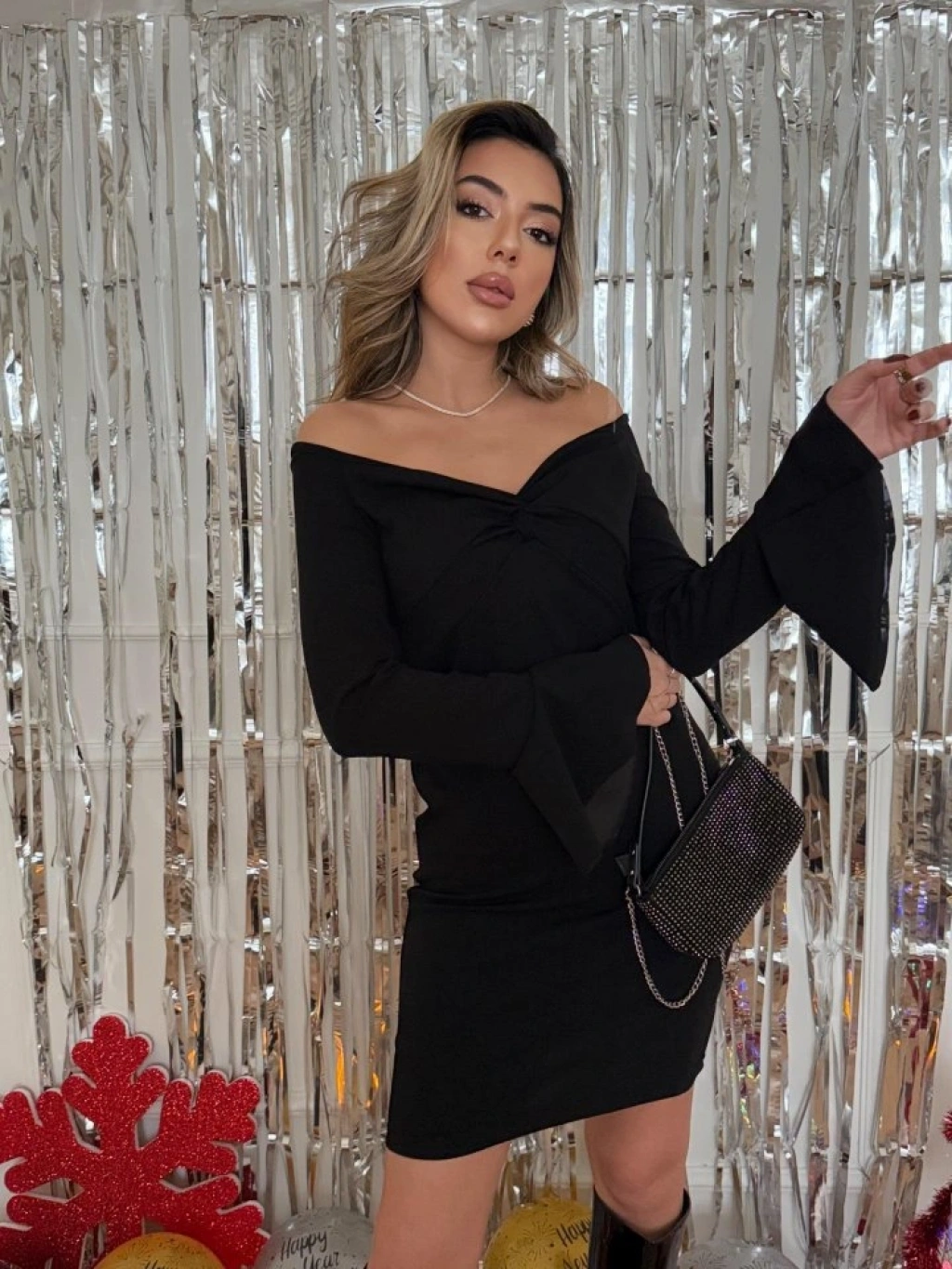 Kadın Yolbaşı özel Uzun Kollu çapraz Derin Dekolte Detaylı Ithal Krep Kısa Elbise