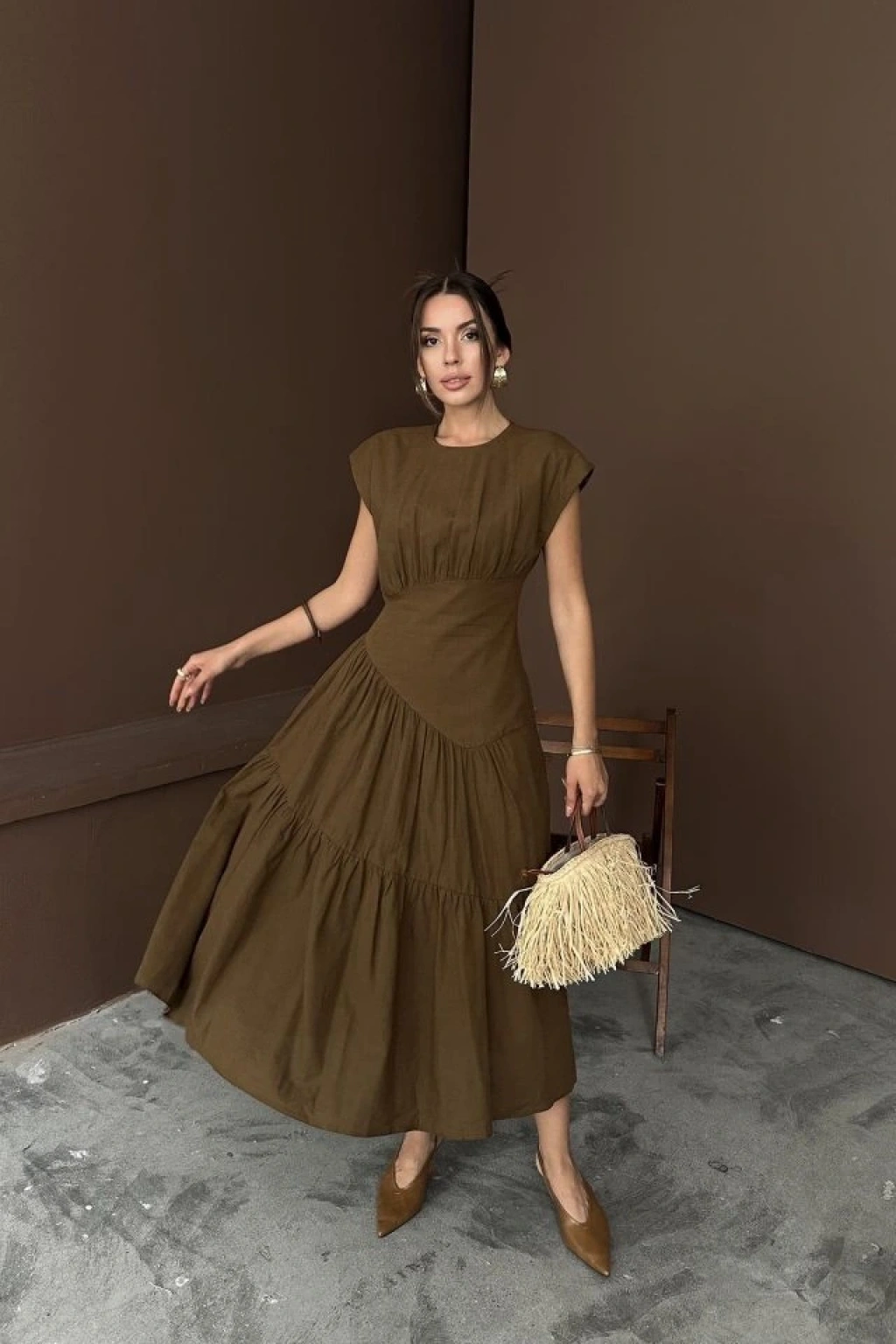 Kahverengi Büzgü Detaylı Keten Elbise