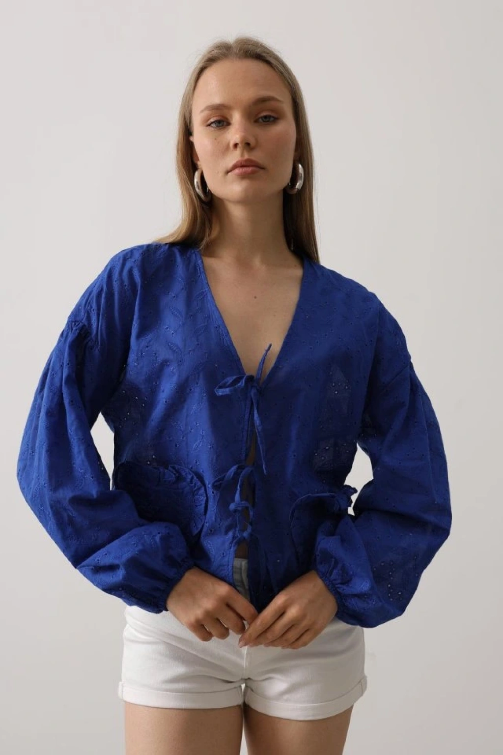 Kalp Detaylı Bağlamalı Brode Bluz - Saks