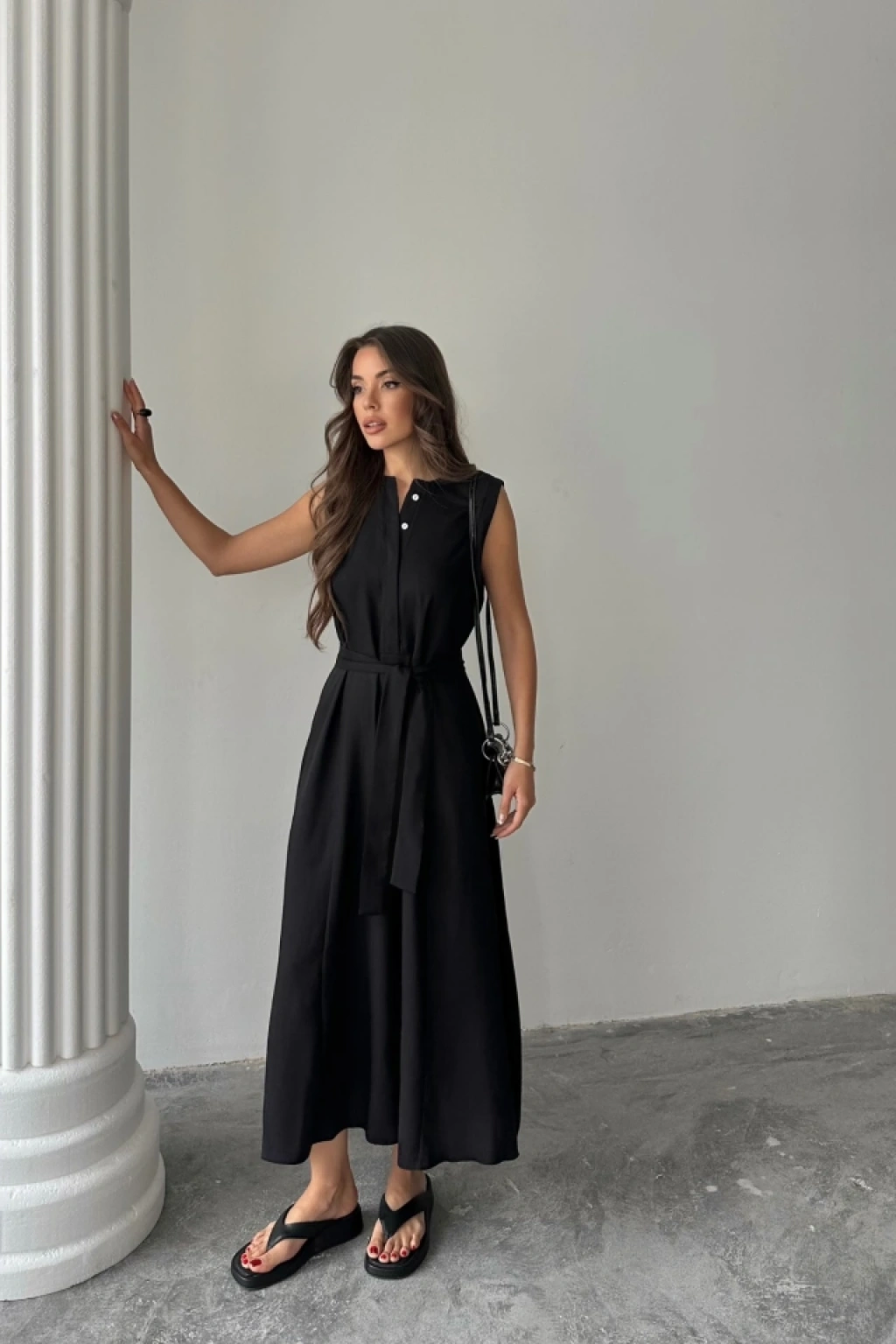 KETEN ELBİSE KOLSUZ BEL BAĞLAMALI MAXİ ELBİSE - Siyah