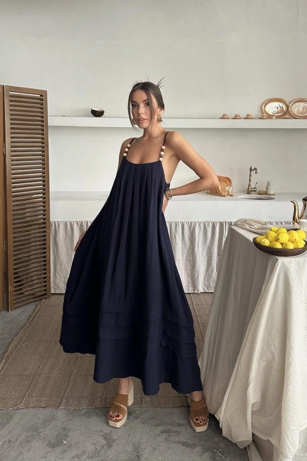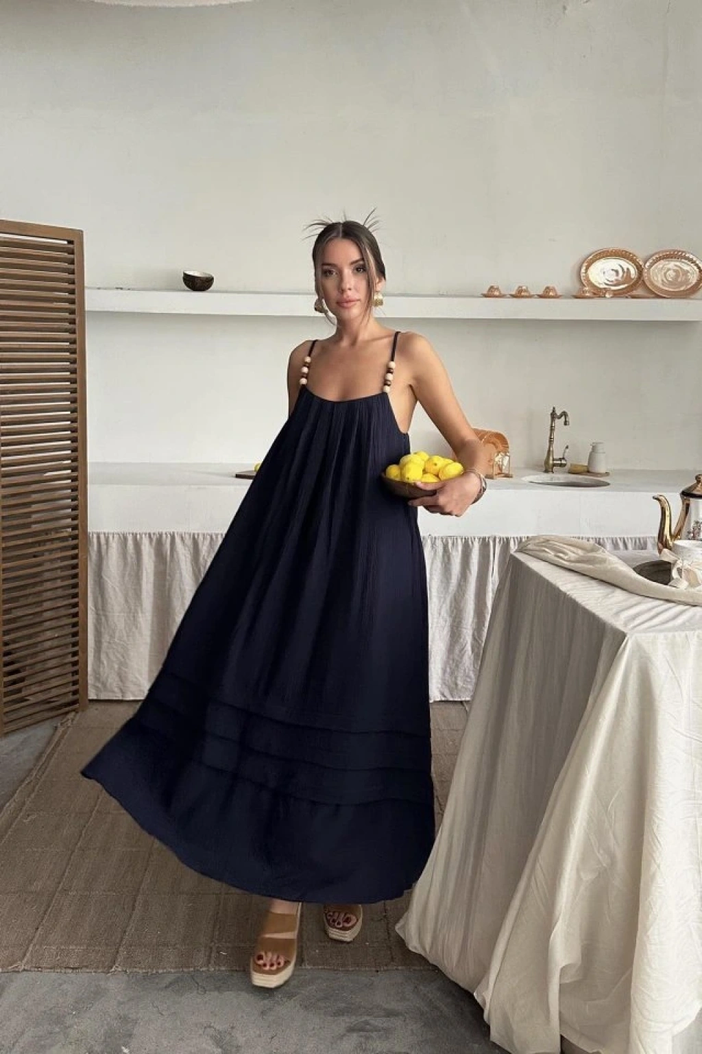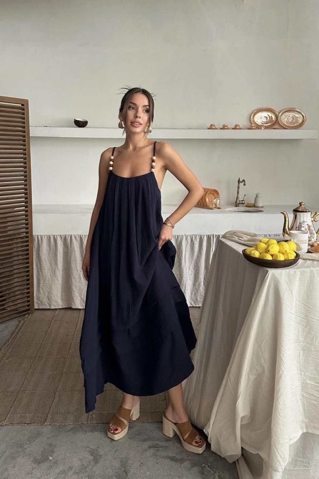Lacivert Askılı Müslin Elbise