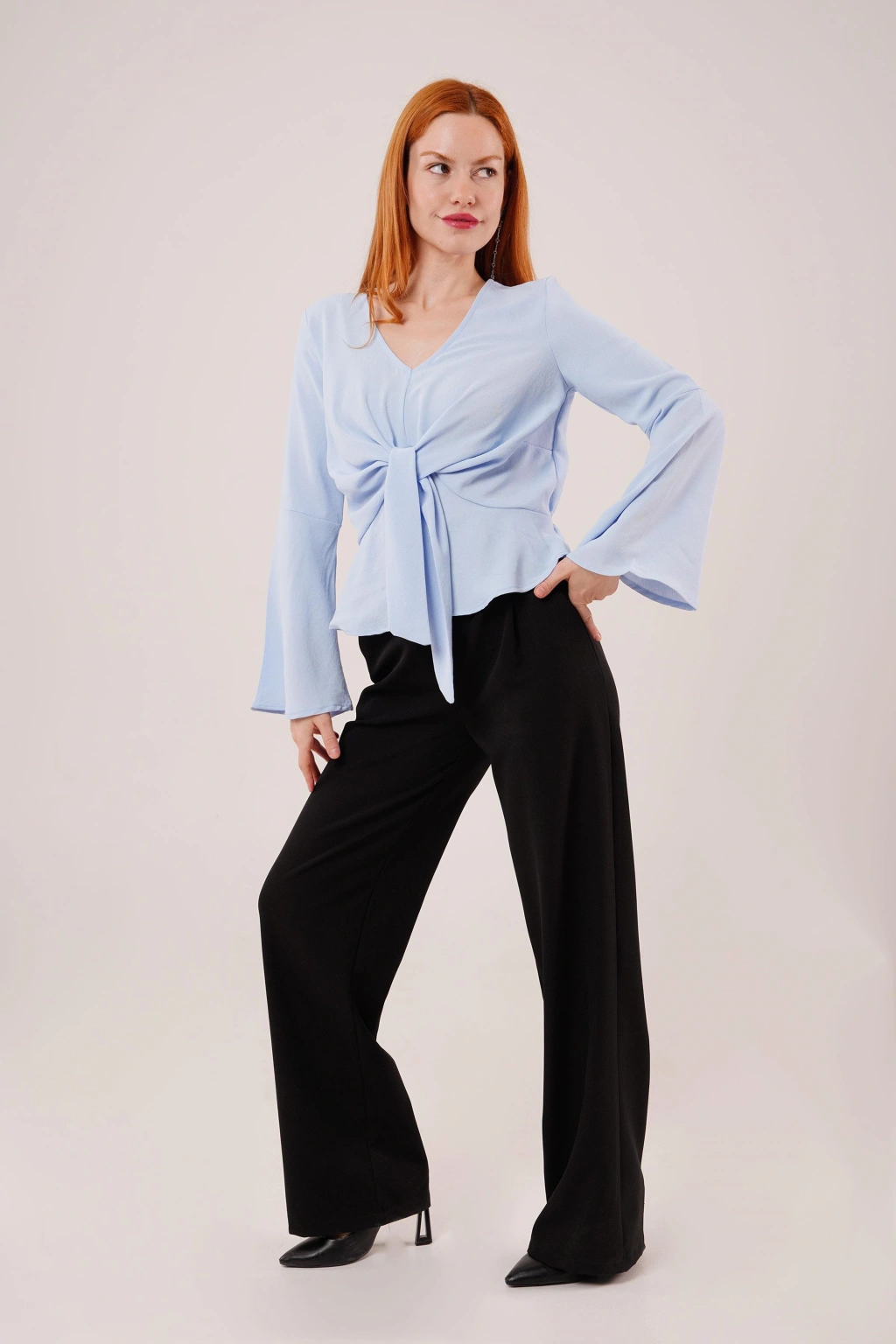 Ön Bağlamalı Volan Kol Bebe Mavisi Bluz