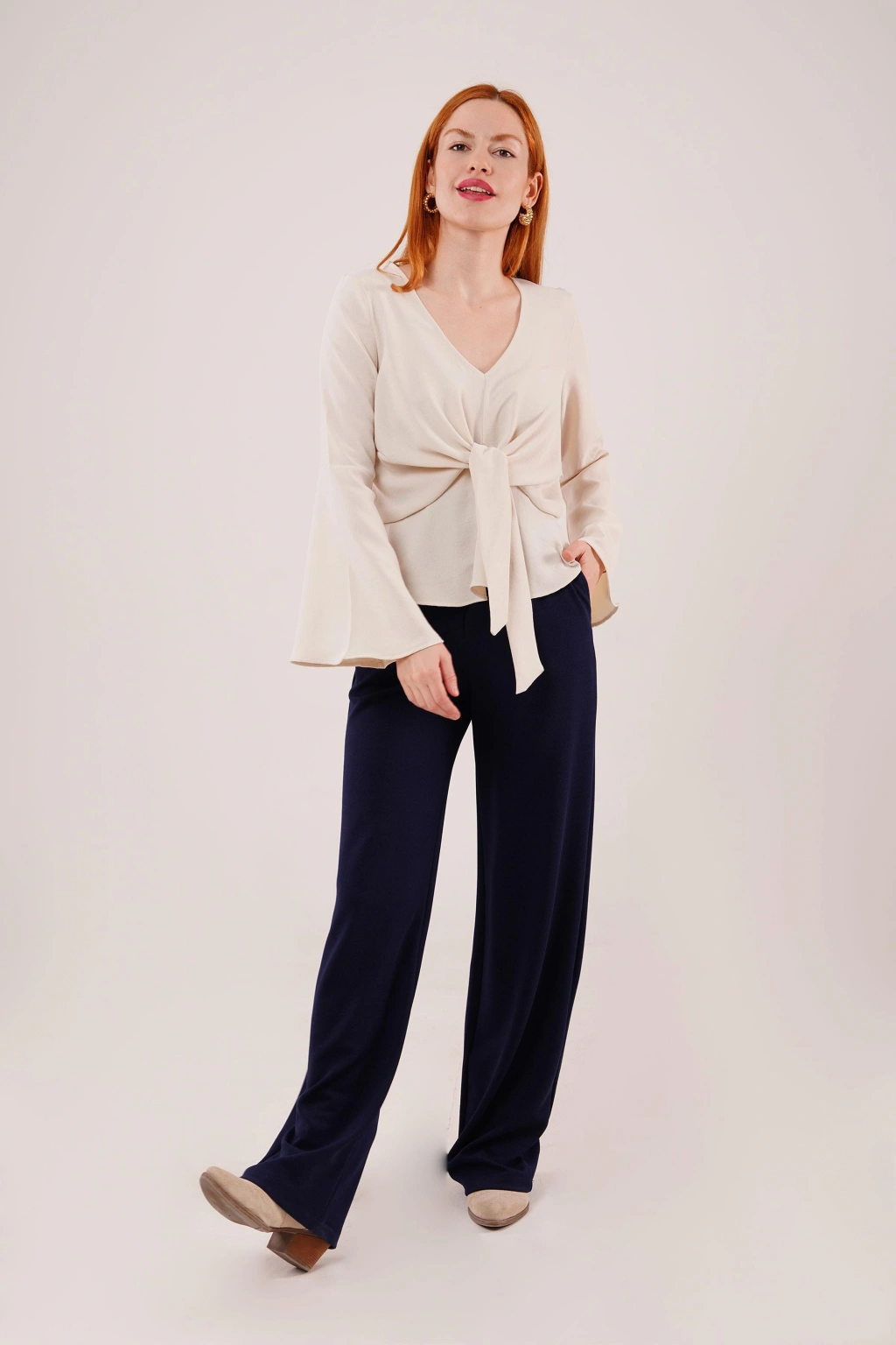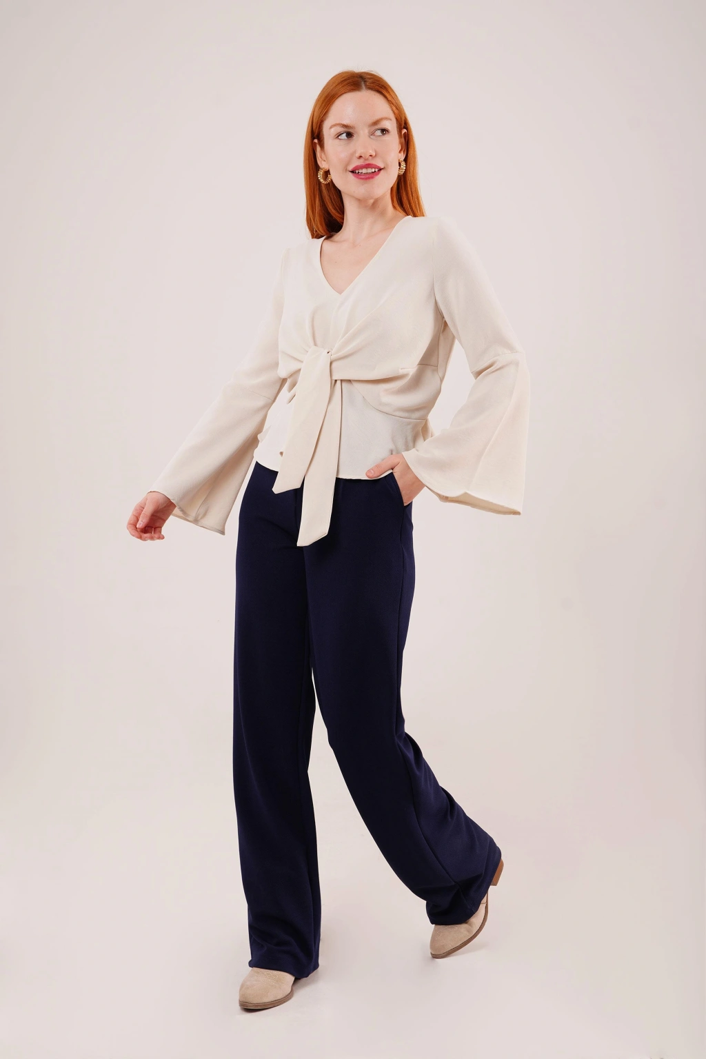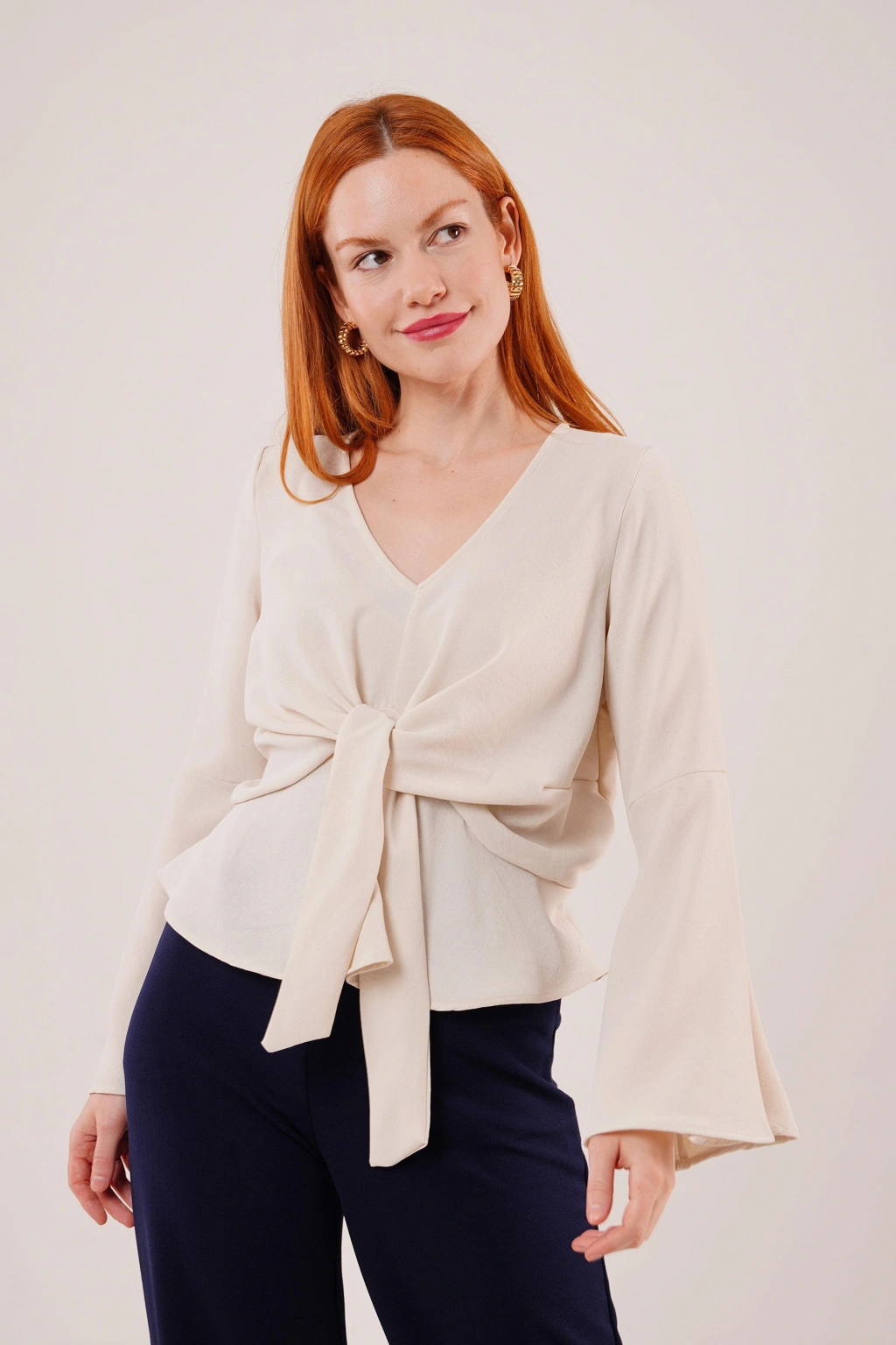 Ön Bağlamalı Volan Kol Ekru Bluz