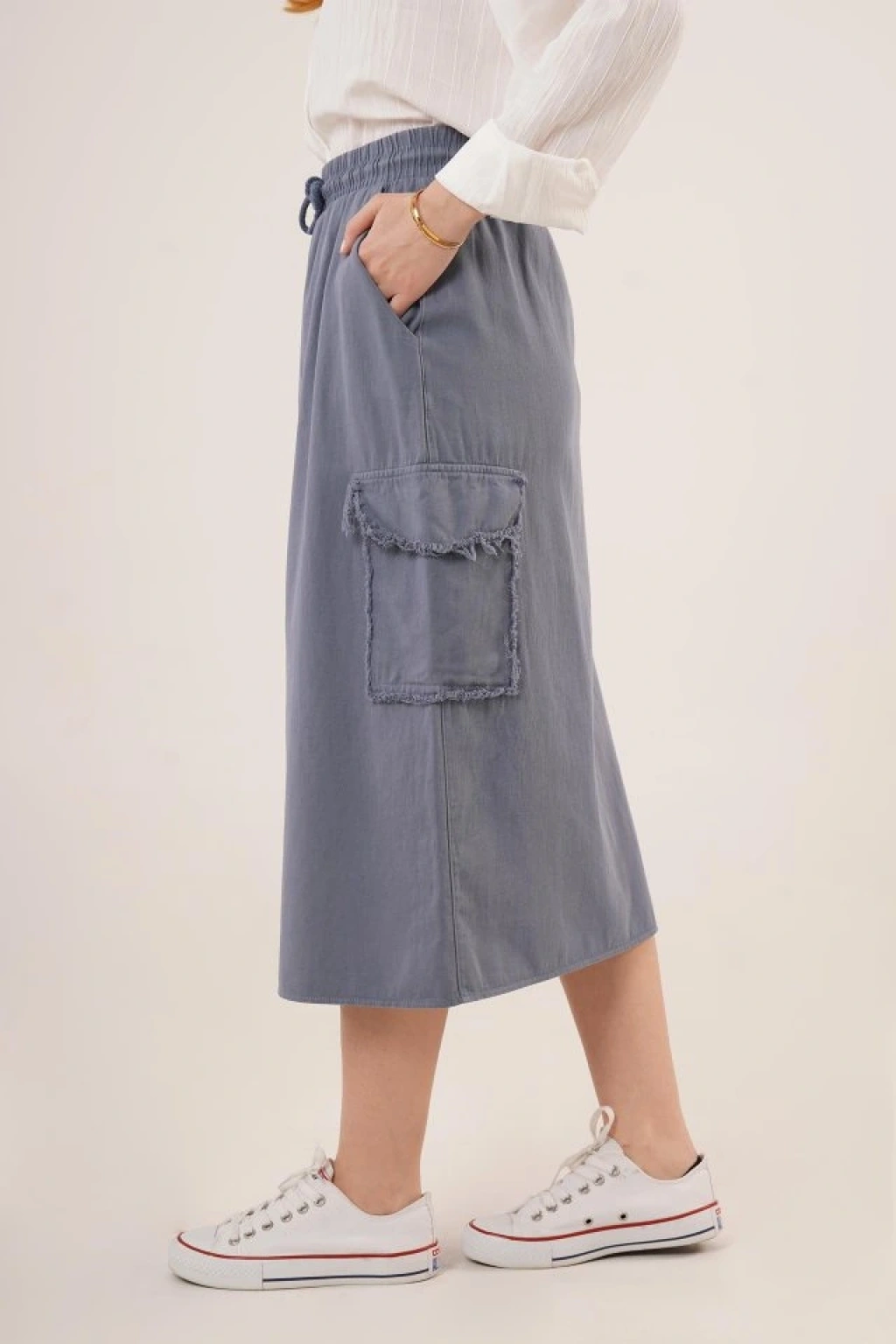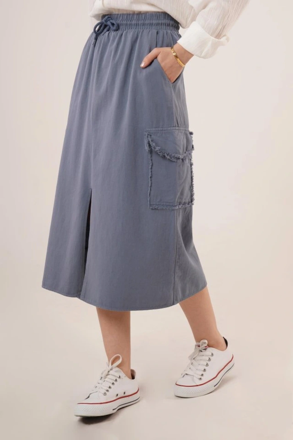 Ön Yırtmaçlı Cep Detaylı İndigo Etek