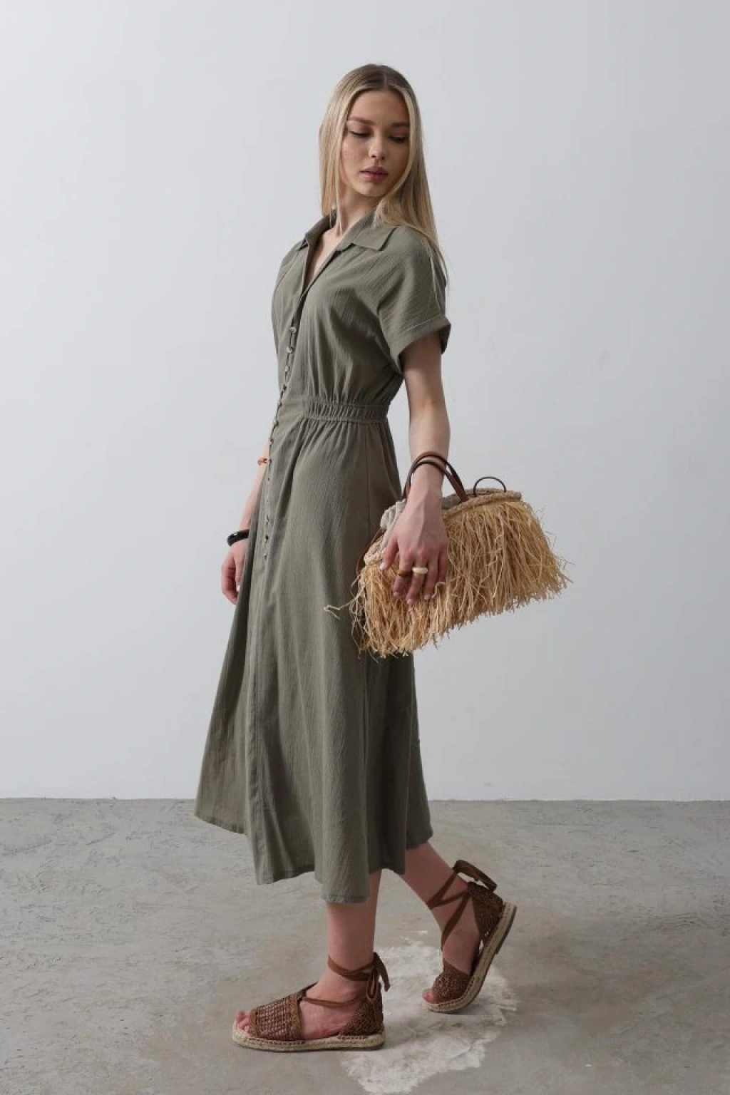 Önü Düğmeli Kısa Kol Elbise - Haki