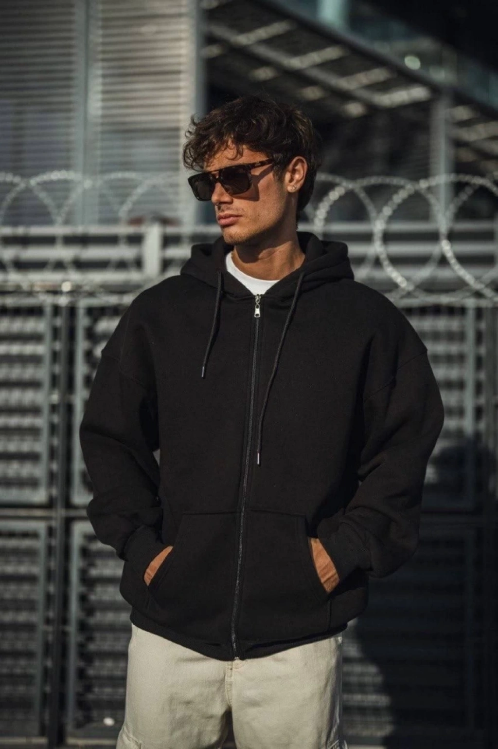 Erkek Kapüşonlu Düz Fermuarlı Hırka iyah