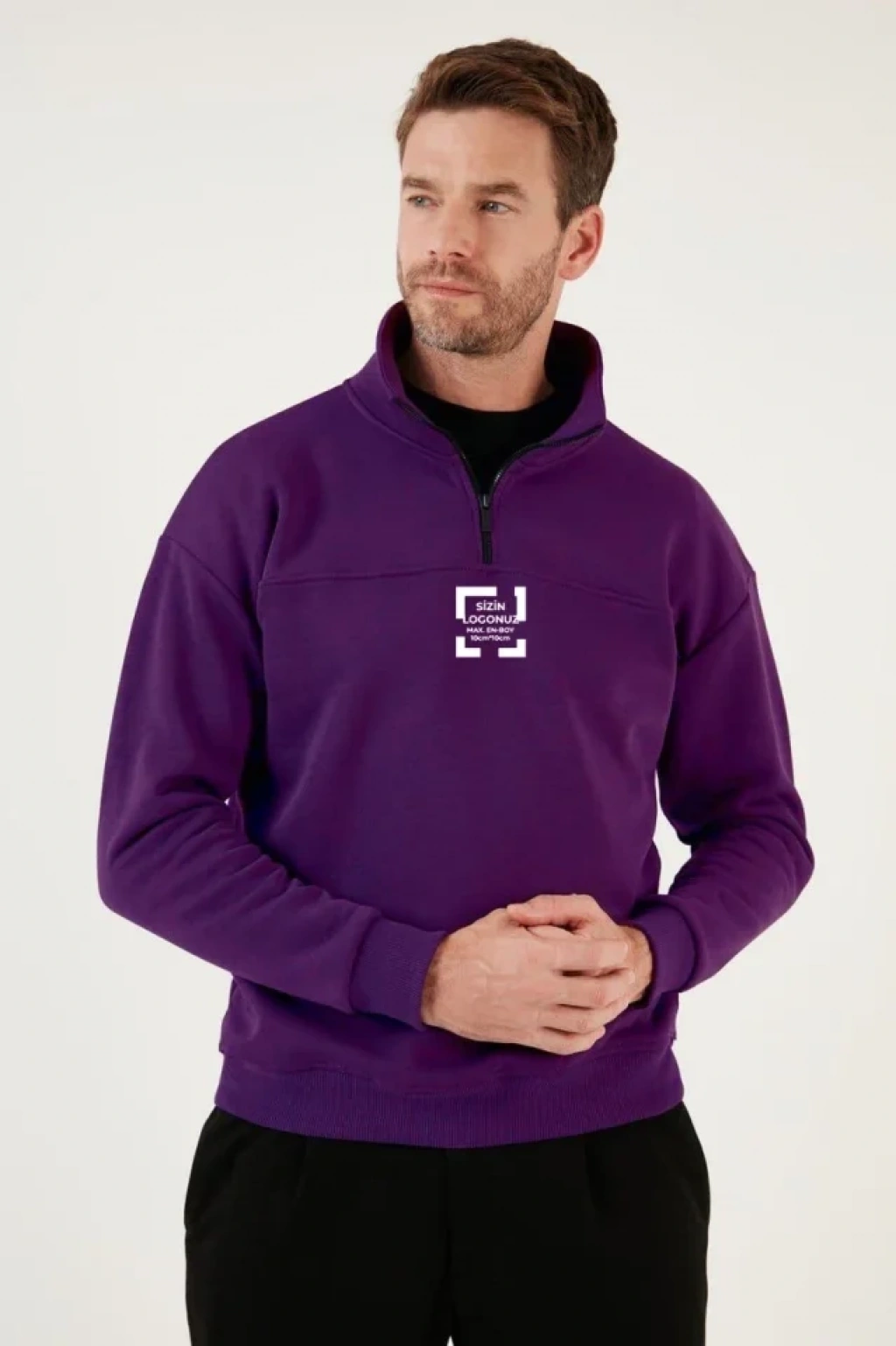 Oversize Yarım Farmuarlı Yakalı Özel Tasarım Basic SweatShirt - Mor