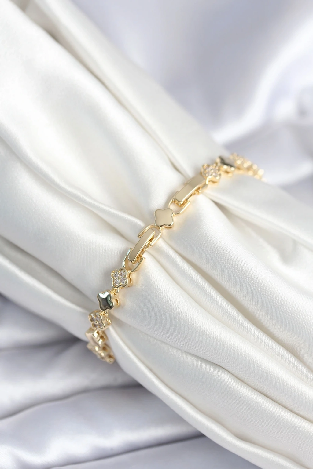 Pirinç Gold Renk Zirkon Taşlı Yonca Model Kadın Bileklik