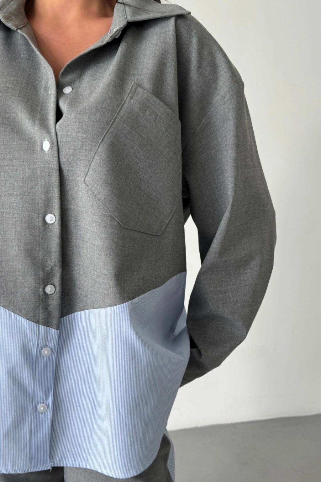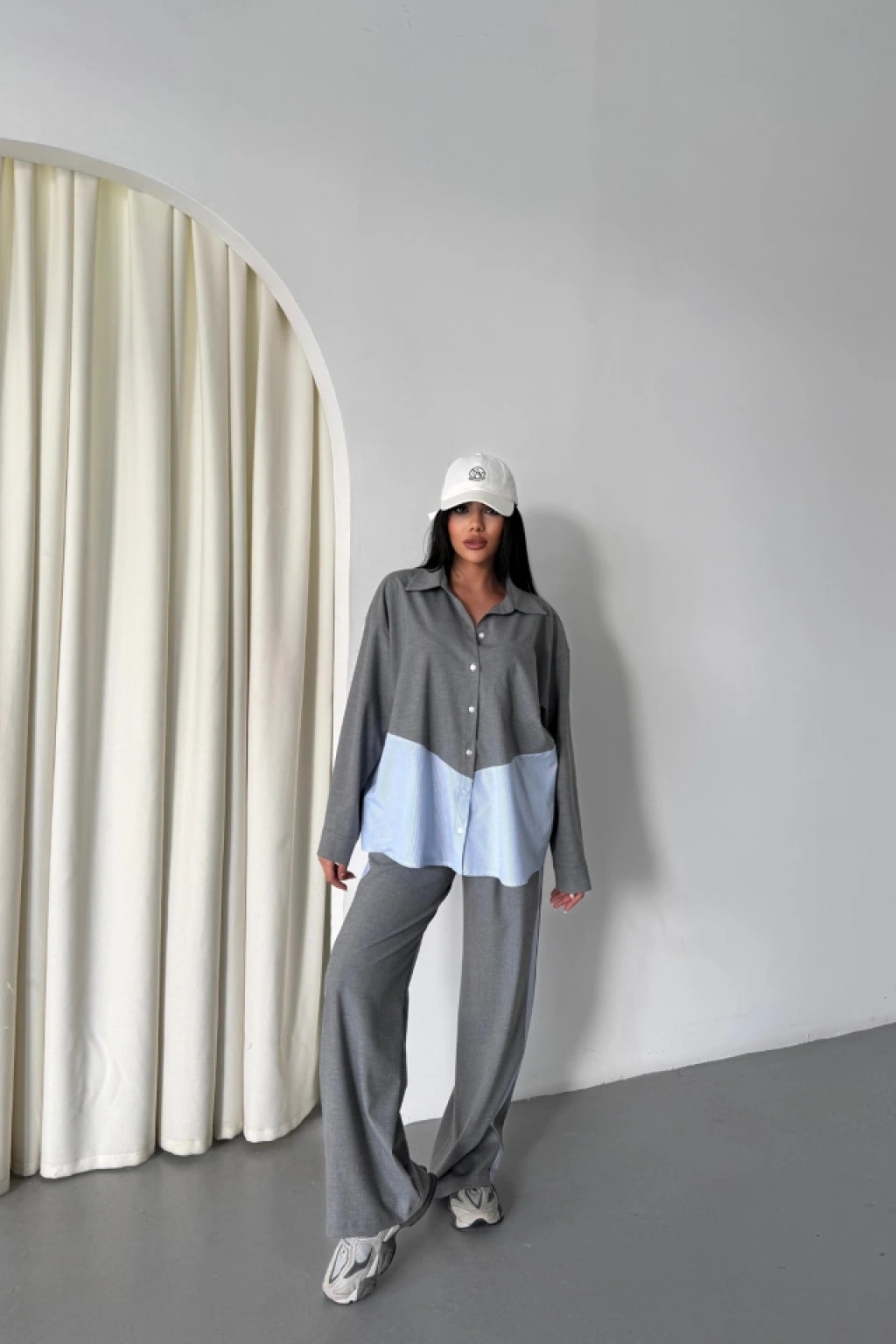 POLYVİSKON - POPLİN PARÇALI GÖMLEK PANTOLON TAKIM - Gri