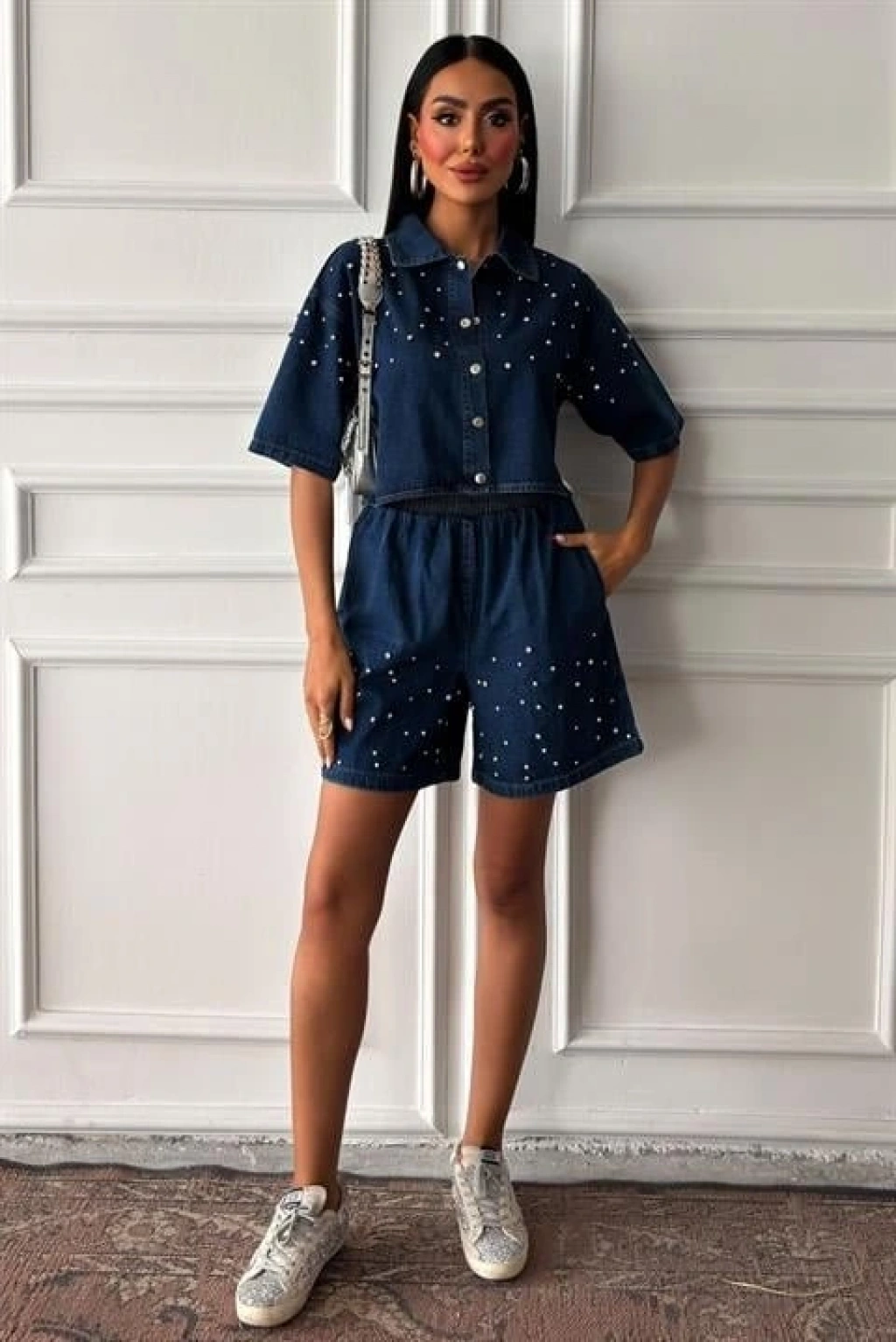 Taş Detaylı Gömlek Şort Denim Takım 10175