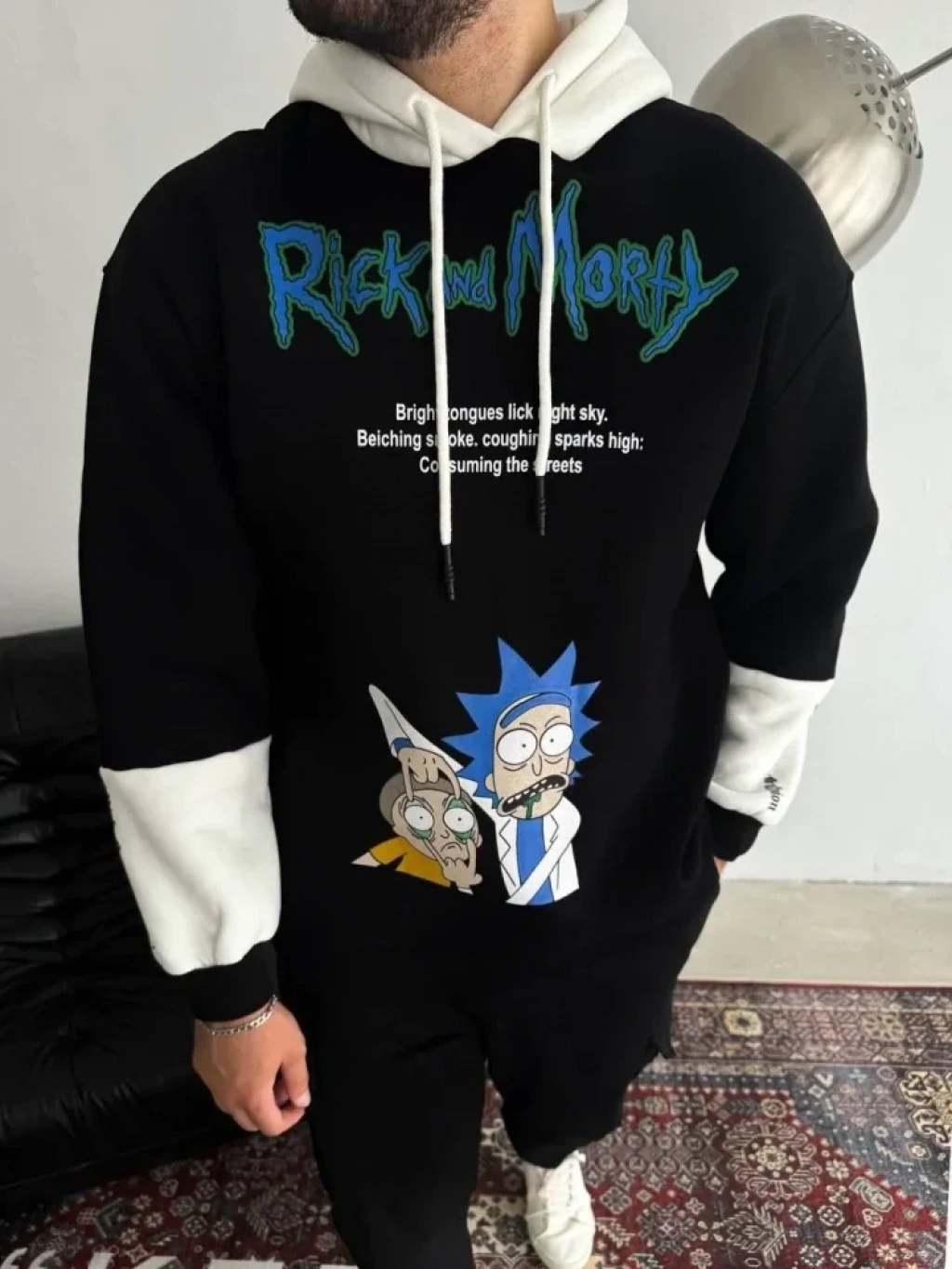 Üç İplik Kapşonlu Parçalı Baskılı weathirt iyah
