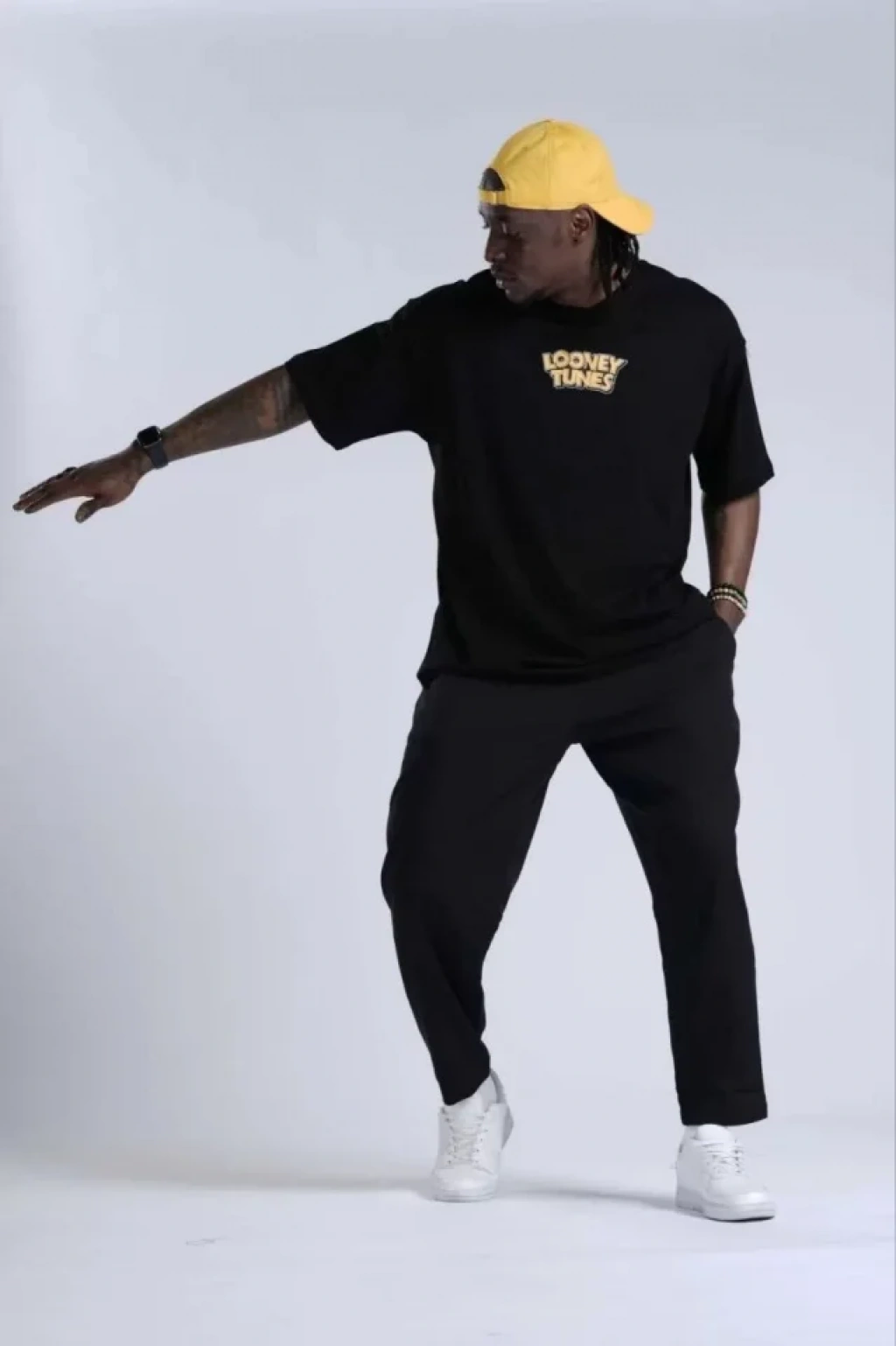 Unisex Bisiklet Yaka Baskılı Oversize T-Shirt - Siyah