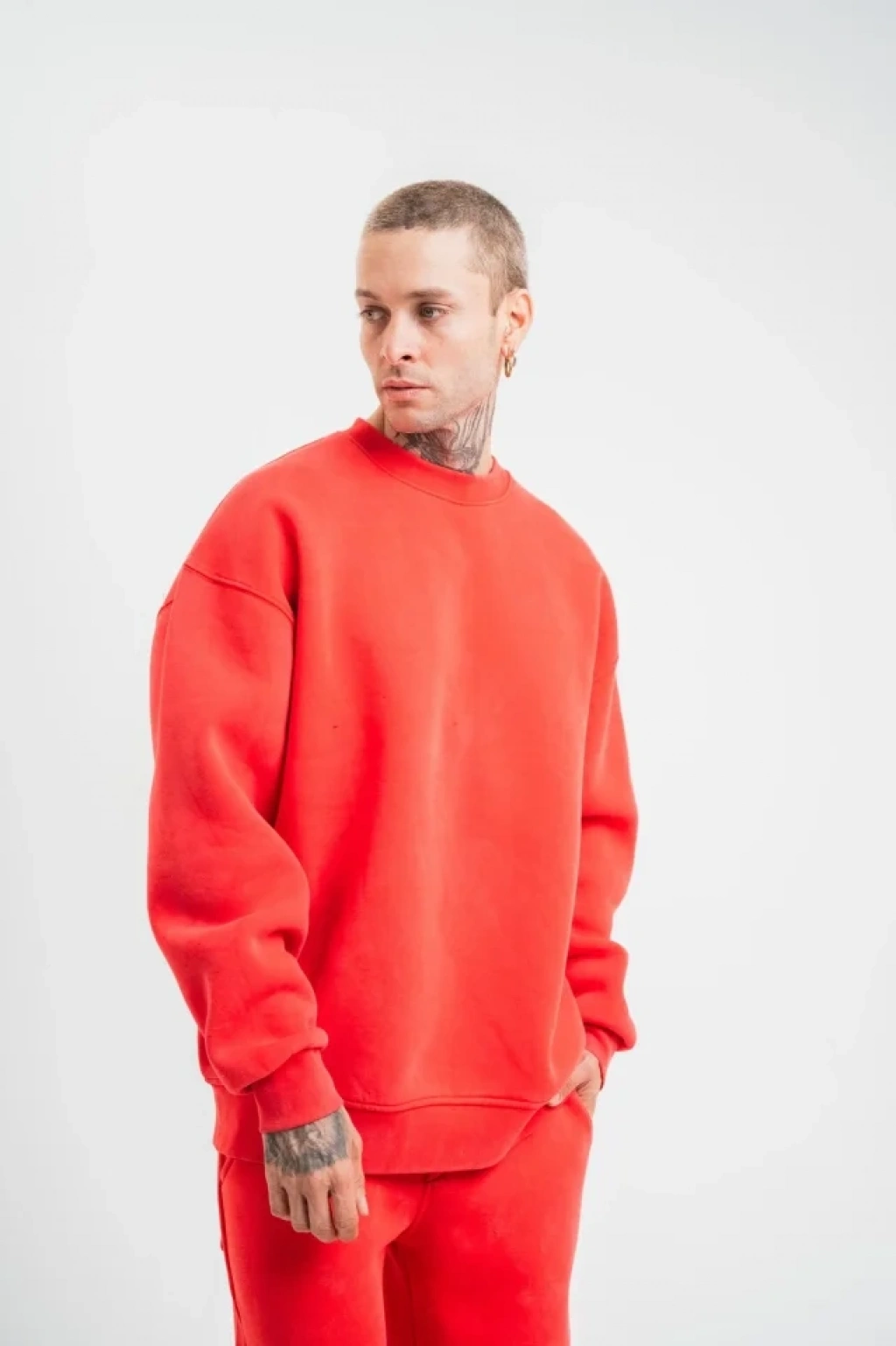 Unisex Uzun Kol Bisiklet Yaka Yıkamalı SweatShirt - Kırmızı