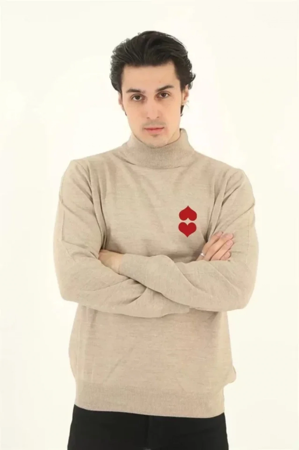 Unisex Yarım Boğazlı Baskılı Dokuma Triko Bej