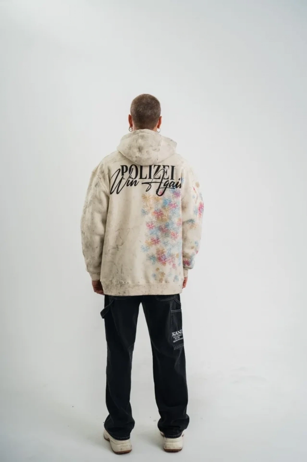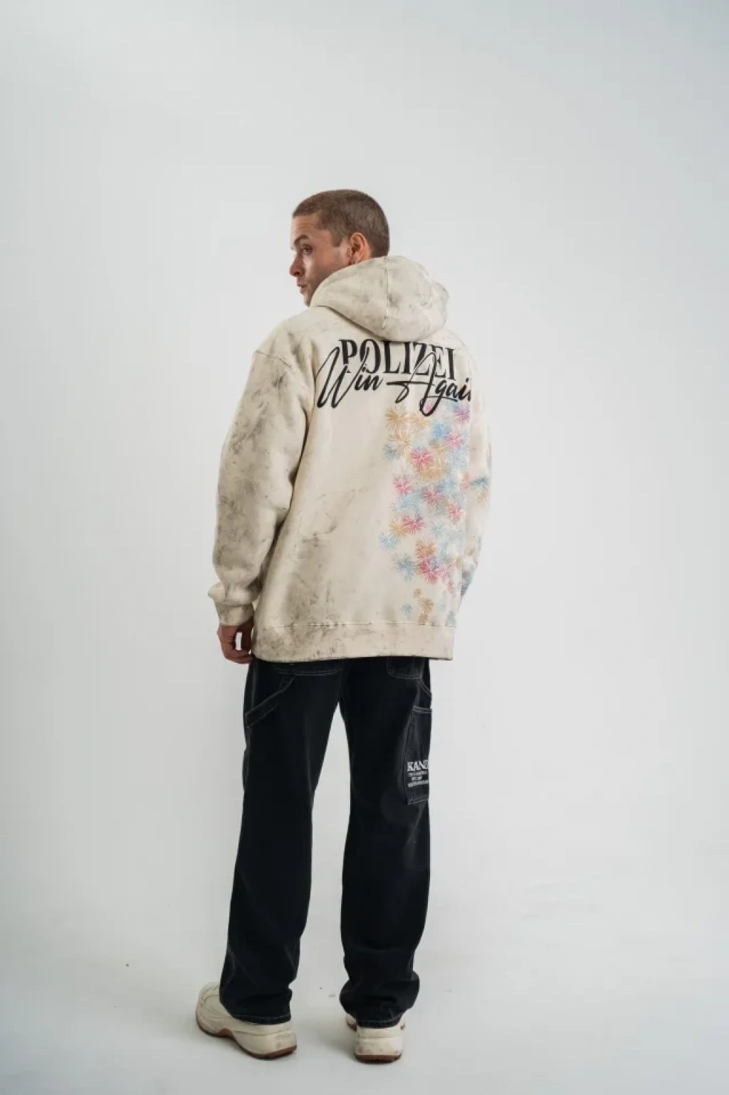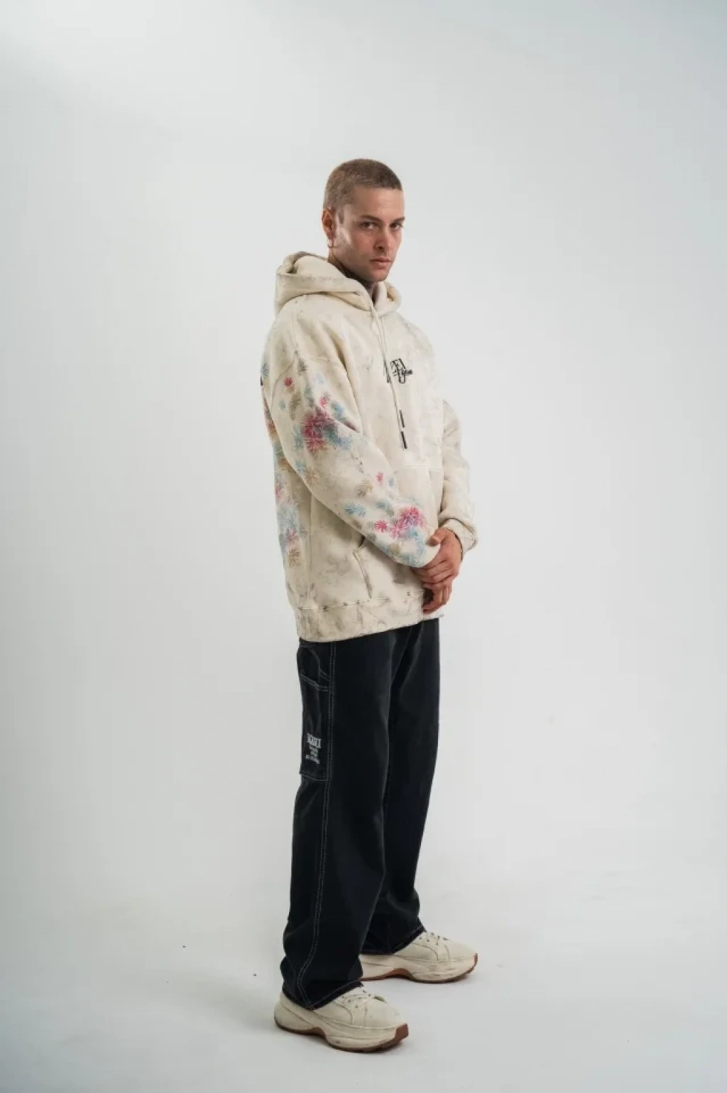 Uzun Kol Kapşonlu Yıkamalı Baskılı weathirt Krem