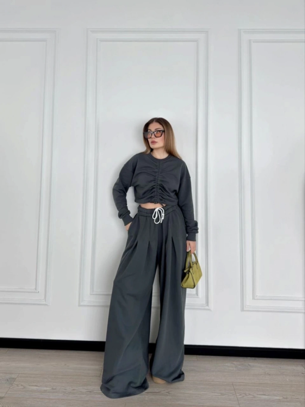 Uzun Kollu Önü İp Büzgülü Crop Ve Pantolon İkili Takım - Antrasit