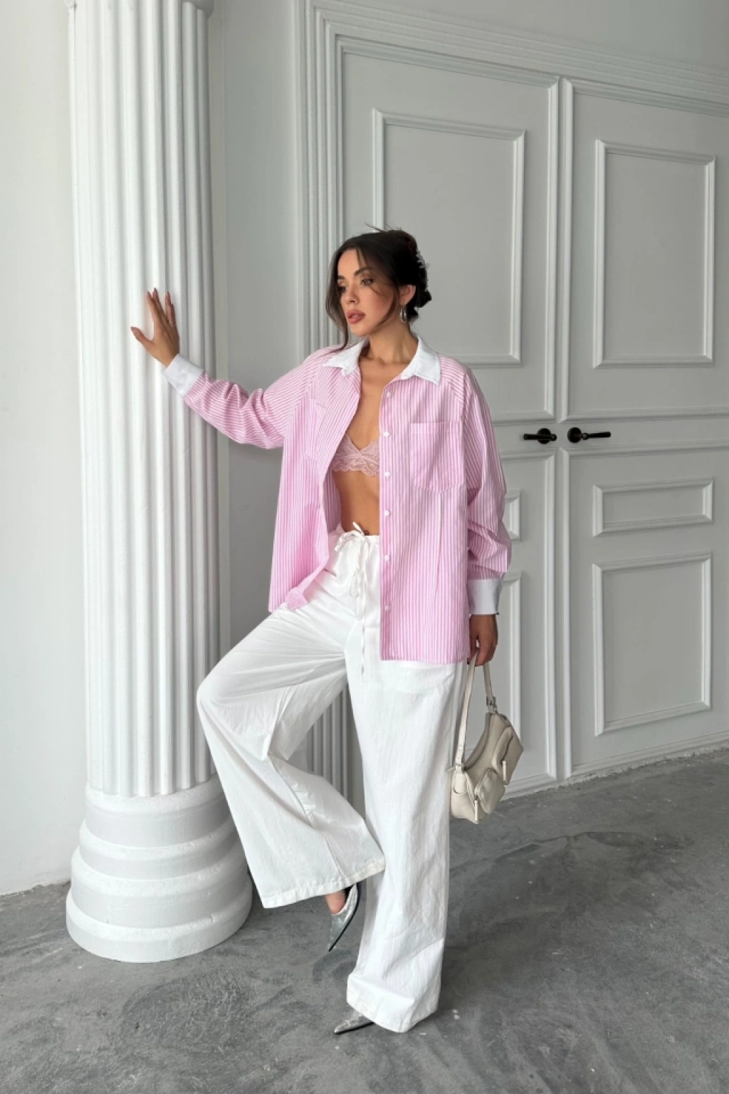 YAKA VE MANŞET BEYAZBOYFRİEND ÇİZGİLİPOPLİN GÖMLEK - Pembe