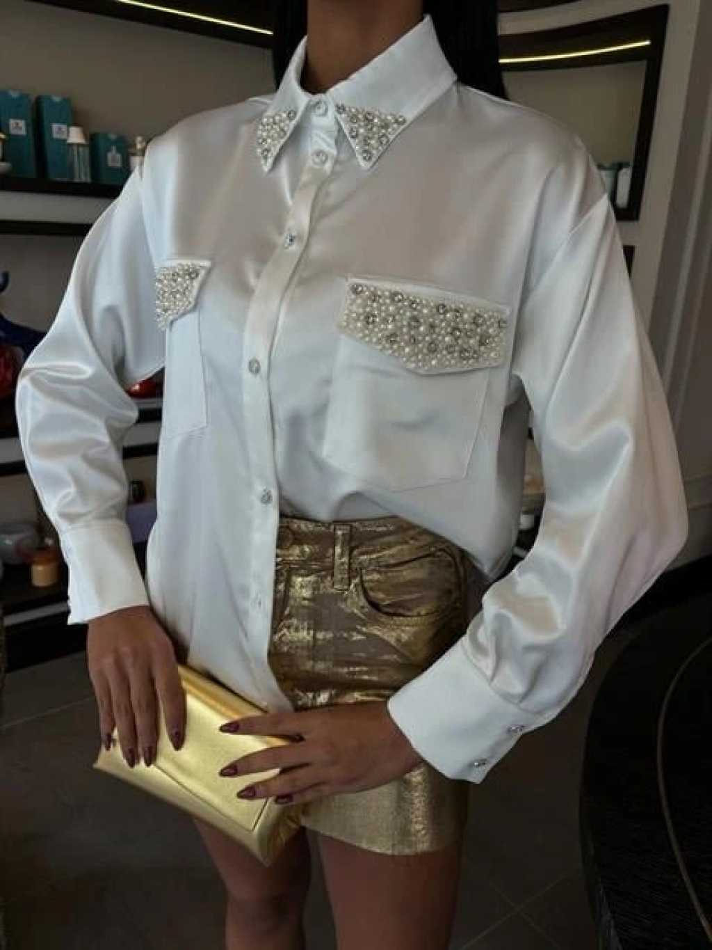 Yaka Ve Cep İnci Taşlı Saten Gömlek 3423