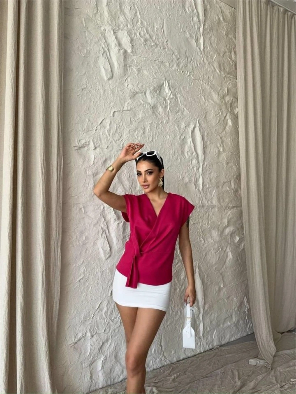 YANDAN BAĞLAMA DETAYLI KOLSUZ BLUZ - Fuşya