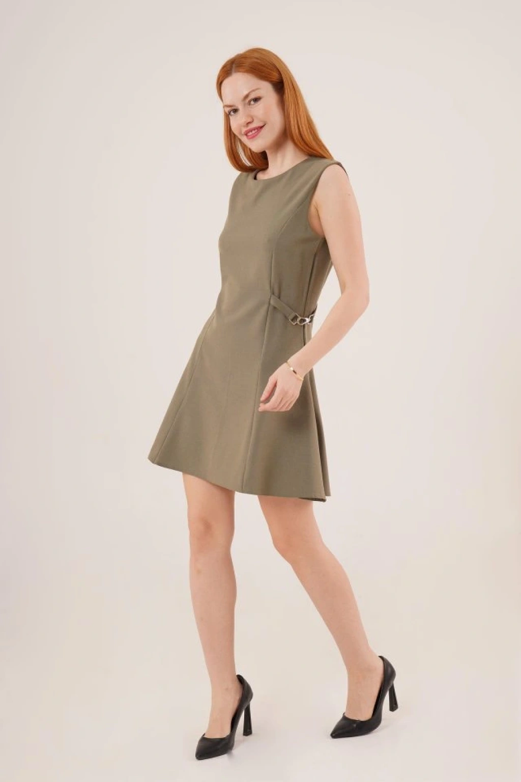 Yanları Zincir Detaylı Sıfır Kol Haki Mini Elbise