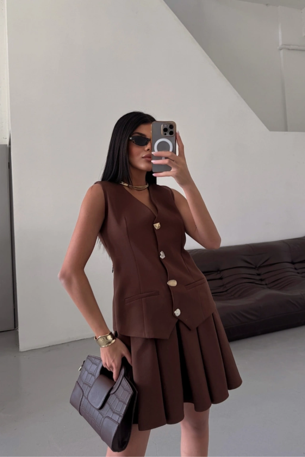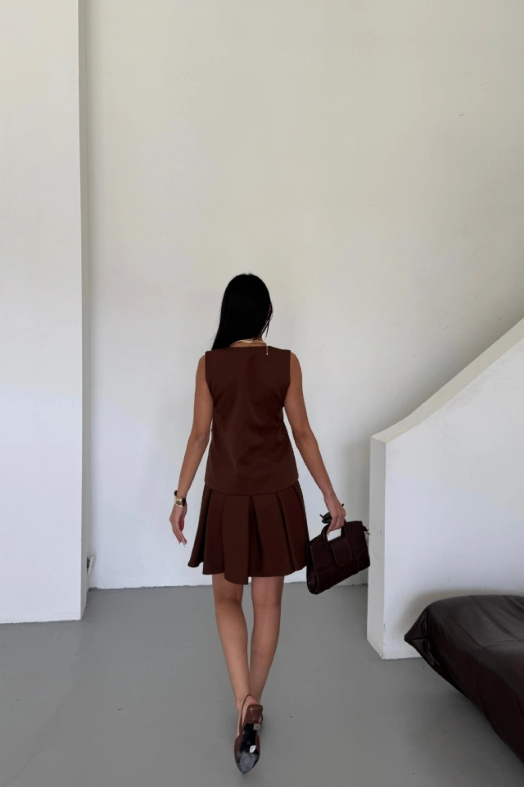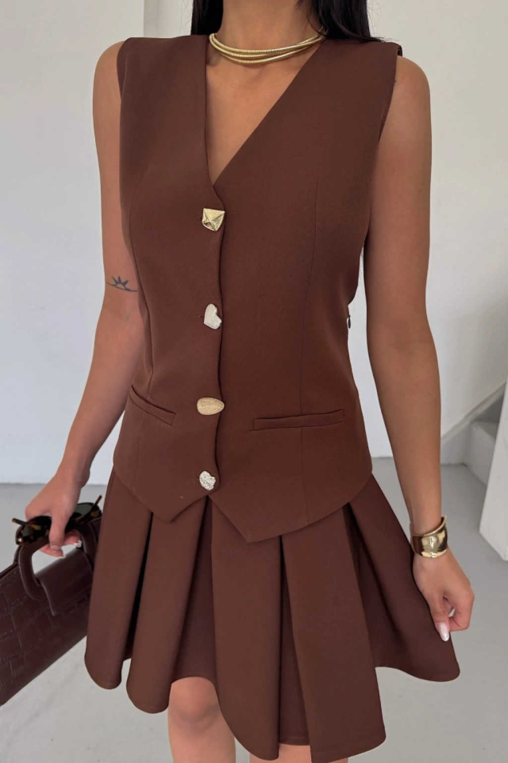YELEK - PİLELİ ETEK GÖRÜNÜMLÜ ELBİSE - Kahverengi